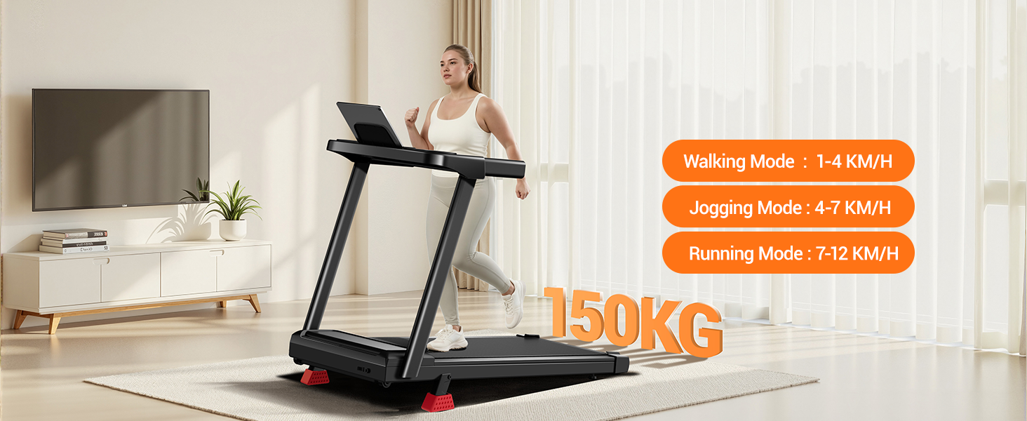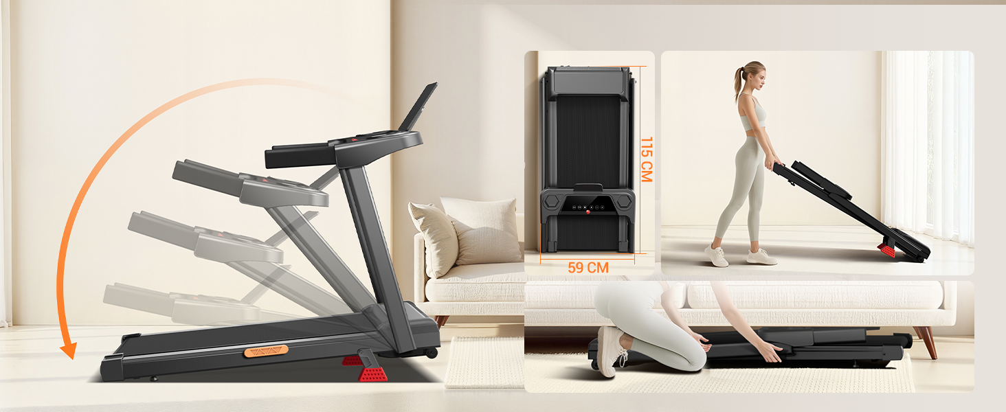- Folding walking pad: This treadmill for home can be easily folded and saves space. The dimensions when unfolded are 115 x 59 x 100 cm, and when folded, it is only 12 cm thick, so it can be conveniently stored in any corner. With a weight of 20 kg and a maximum load of 136 kg, it is suitable for users of a wide range of heights.