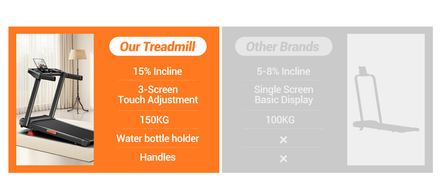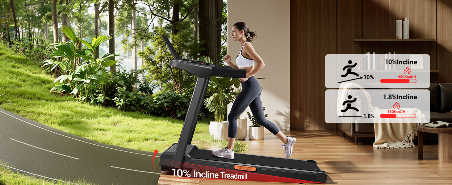 - 10%/15% incline: This folding treadmill for home is equipped with 10%/15% adjustable incline, simulates a realistic mountain running experience, increases calorie consumption by 60% and improves knee protection by 30%, reducing the risk of injury. It also strengthens cardiovascular endurance by 20% and allows efficient home training.